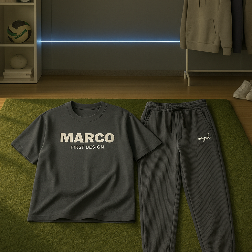 | Logo Details | “MARCO” Printed on T-shirt, “angel” Embroidery on Pant |
